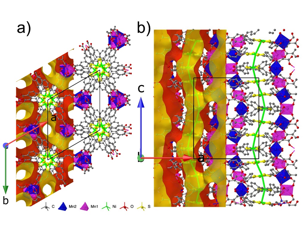 图3 配合物1的晶体结构图,(a) 在c-轴方向菱形孔道, (b) 在b-轴方向金属二硫烯中心堆积