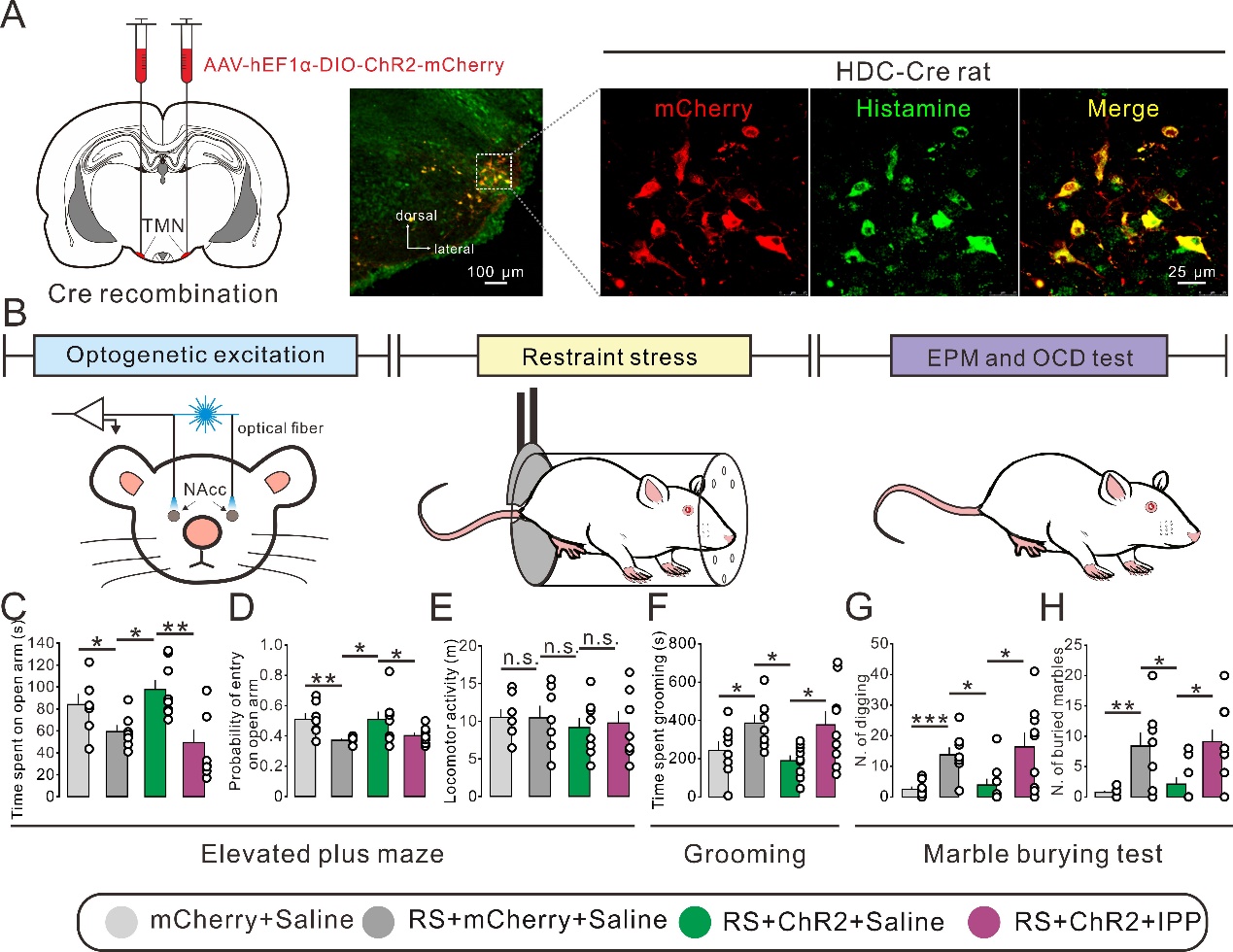 图1. 光遗传学选择性激活TMN-NAc组胺能神经投射改善由束缚应激诱导的大鼠焦虑样和强迫症样行为。