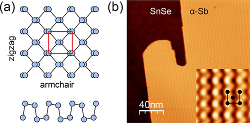 图二. 单层αSbSnSe衬底上的外延生长。(a) αSb的原子结构(俯视图和侧视图)(b) 单层αSbSnSe衬底上外延生长的STM