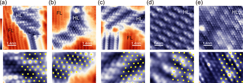 图四. 半层Sb的STM原子结构图。(a-c) 原生样品的原子分辨图。(d,e) 在350K温度下退火30分钟后的原子分辨图。上排图的部分区域放大得到下排图。