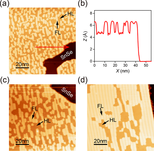 图三. 沉积SnSe衬底上的Sb在退火过程中的形貌变化。(a) 350K温度下在SnSe衬底上生长的Sb的形貌。(b) 沿着(a)图红色箭头测量的高度信息。(c) 350K温度下进行退火10分钟的形貌图。(d) 350K温度下退火30分钟的形貌图。