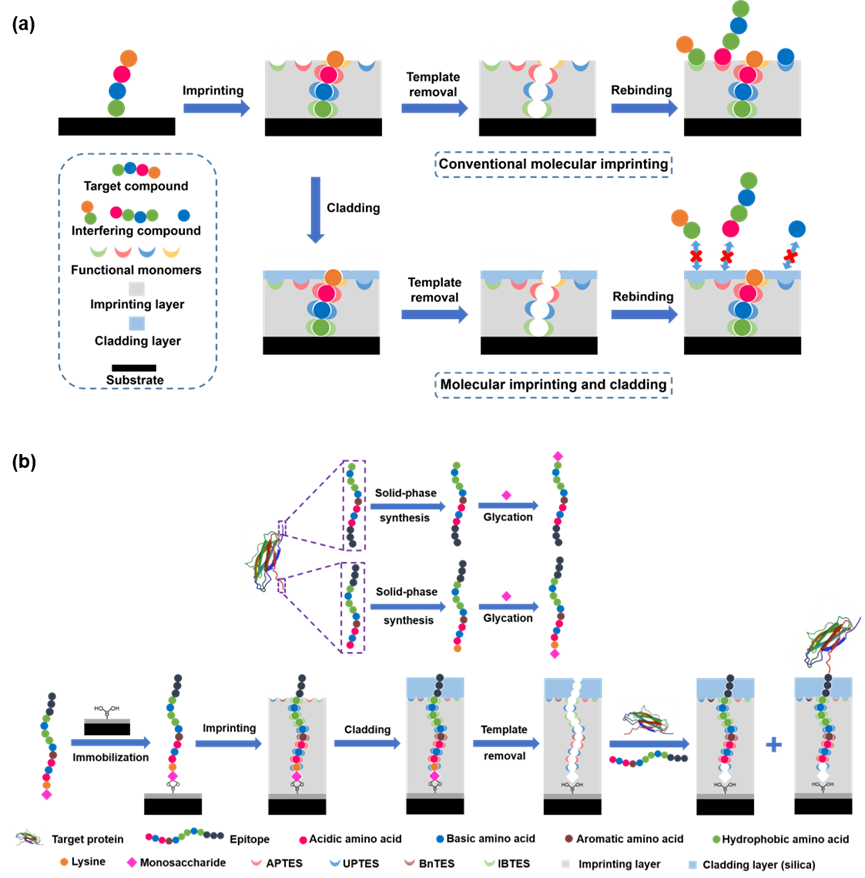 图1. (a)分子印迹和包覆策略的原理示意图,(b)硼亲和锚定表位定向表面印迹和包覆法的原理示意图