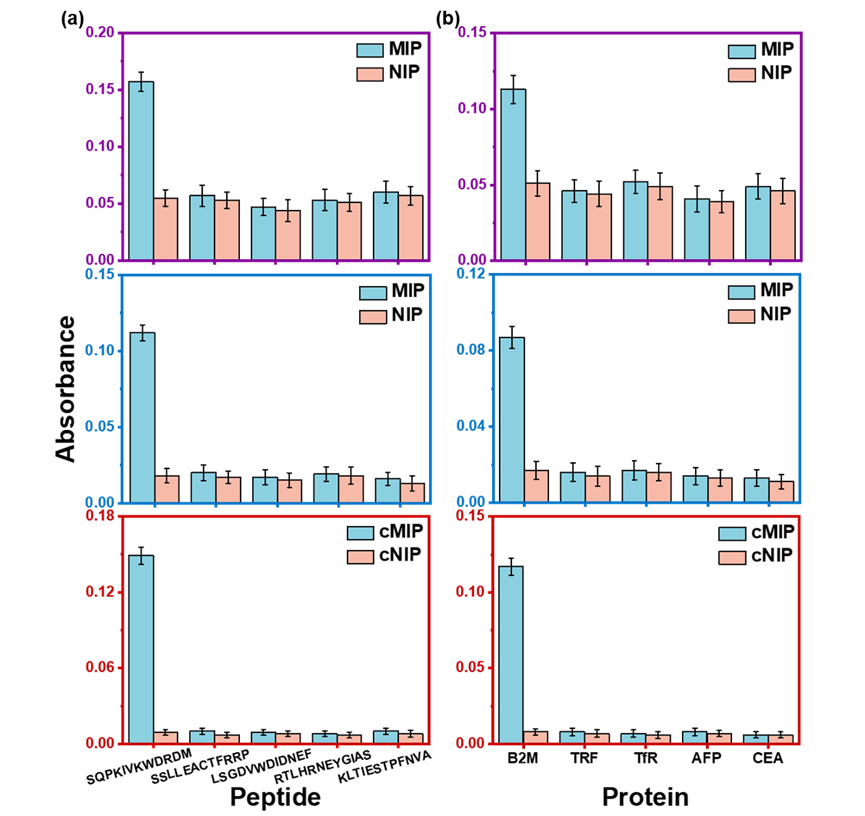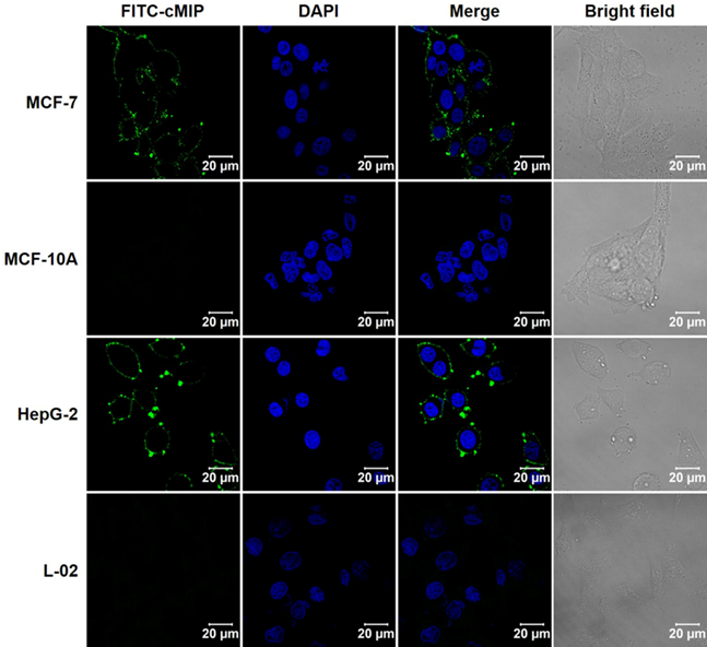 功能单体比例和印迹时间是两个最重要的印迹条件,主要根据印迹因子(IF)进行优化,其中IF为MIP与非印迹聚合物(NIP)结合模板量的比值。传统印迹方法制备的MIP和NIP的结合能力随着整体功能单体比例的增加而增加,MIP在第8个印迹条件(图2,紫心)达到最高,然而为了获得最高的IF值,避免较高的非特异性吸附,MIP只能牺牲结合能力,优化得到的印迹条件(图2a,蓝心)并非正真的最优,而实为伪最优。而MIC策略制备的cMIP虽然结合能力对单体比例的依赖性与MIP几乎相同,但是相应的cNIP在所有的单体比例下的结合能力均非常低,因此cMIP能够同时获得最高的结合能力和较低的非特异性吸附,IF值大大提高,优化得到的印迹条件(图2b,红心)是真正最优条件。MIC策略相比于传统印迹方法的优势在于:MIP在最强亲和力的印迹条件下(图3a,紫线)的特异性非常差(图4,紫框),而在伪最优印迹条件下,虽然特异性增高(图4,蓝框),但是亲和力大大减弱(图3a,蓝线),显然MIP的特异性增高是以牺牲亲和力为代价的;而cMIP在真正最优印迹条件下能够同时获得最强的亲和力(图3b,红线)和最高的特异性(图4,红框),已经在癌细胞靶向荧光成像(图5)和c肽分析(图6)中展现出显著优势。