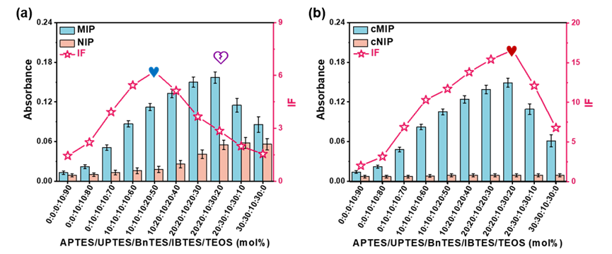 分子印迹是重要的仿生识别材料制备技术,分子印迹聚合物(MIP)作为重要的抗体模拟物,已经在分离、疾病诊断、药物递送、单细胞分析、生物成像和癌症诊疗等领域得到了广泛应用。国际上对MIP的分子识别性能的优化,主要是考虑分子印迹空腔的结构和性能。而实际上,分子印迹材料由印迹空腔和非印迹区域组成,其整体分子识别性能不仅由印迹空腔决定,还受到非印迹区域的影响。通常的分子印迹策略中,由于非印迹区域也是在与印迹空腔相同的聚合条件下形成的,因此,在"最优"条件下,在非印迹区域表面也存在着丰富的功能基团,能够产生明显的非特异性吸附,从而所得MIP无法同时具备最强的亲和力和最高的特异性,而只是这两者间的折中。