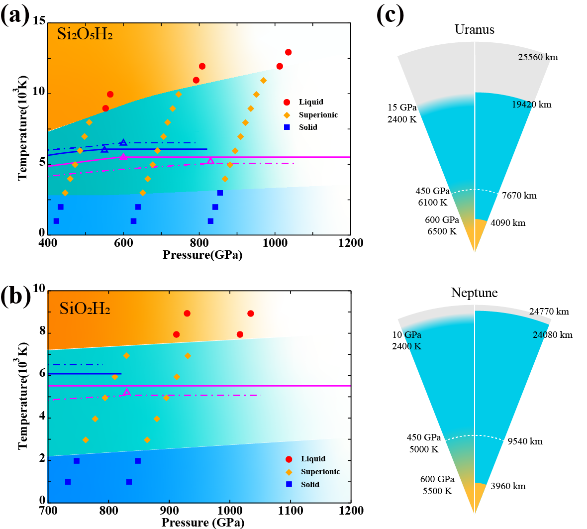 他们用自主开发的基于机器学习和图论辅助的晶体结构搜索方法,结合第一性原理计算,对高压下的硅--氢三元化合物的晶体结构,以及它们在高温高压下的物态进行了系统研究,预测了三种在高压下稳定的硅--氢三元化合物,其组分为Si2O5H2, SiO2H2SiOH2。它们的稳定压强分别约为450650500 GPa以上,前两种化合物可以视为二氧化硅的水化物和氢化物。随后,他们使用第一性原理分子动力学详细研究了这些化合物在高温高压下的动力学行为,并构建了温度压强相图。模拟结果表明,随着温度升高,三种化合物均有从固态到超离子态再到液态的相变。在硅--氢体系中,超离子态表现为硅-氧框架保持固体行为,而氢则可以像液体一样自由扩散(图1)。将硅--氢三元化合物相图与目前的行星模型对比,发现二氧化硅-水化合物与二氧化硅-氢化合物的超离子态区间涵盖了天王星和海王星内部的温度压强范围(图2),说明它们很可能在行星内部大量存在。