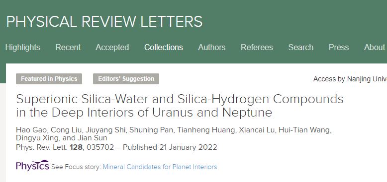 相关研究成果以"Superionic Silica-Water and Silica-Hydrogen Compounds in the Deep Interiors of Uranus and Neptune"为题,于日发表在国际物理学顶级学术期刊《Physical Review Letter》上。【Phys. Rev. Lett. 128, 035702 (2022)并被选为编辑推荐文章Editors Suggestion),同时美国物理学会Physics杂志还就该工作发表了题为"Mineral Candidates for Planet Interiors"的焦点评论Focus)。孙建教授课题组高豪博士(目前在德国马普所做博士后刘聪博士(目前在西班牙加泰罗尼亚理工做博士后论文的共同第一作者,孙建教授通讯作者凯发k8官网物理学院邢定钰院士王慧田教授,地球科学与工程学院陆现彩教授提供了深入指导,合作者还包括孙建教授课题组的学生施九洋、潘书宁和黄天衡该项研究得到了凯发k8官网微结构科学与技术协同创新中心、固体微结构物理国家重点实验室的支持,得到了国家自然科学基金委杰出青年基金、中央高校基本业务费、凯发k8官网卓越研究计划等经费的资助。相关计算工作主要在凯发k8官网微结构协同创新中心高性能计算中心、凯发k8官网高性能计算中心超级计算机上进行。高豪