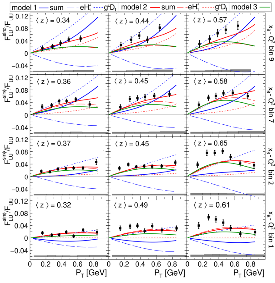 美国杰斐逊实验室(JLab)的CLAS合作组最近在测量极化电子-质子散射的半举DIS时获得了目前最广泛的高精度束SSAs,并具有大范围的全微分多维运动学。与理论计算的比较(如图2所示)表明,这些数据有望区分存在矛盾的反应模型和效应。在当前理论背景下,人们看到了对演生强子质量和新信号敏感的分布函数在支持质子波函数中强关联关键作用方面的重要性。因此,将这些测量结果纳入全局拟合,并结合未来对非极化反应截面和极化靶自旋不对称性的测量,将通过描述自然界最自然的理论框架--相对论量子场论--为质子的三维结构提供深入的见解。