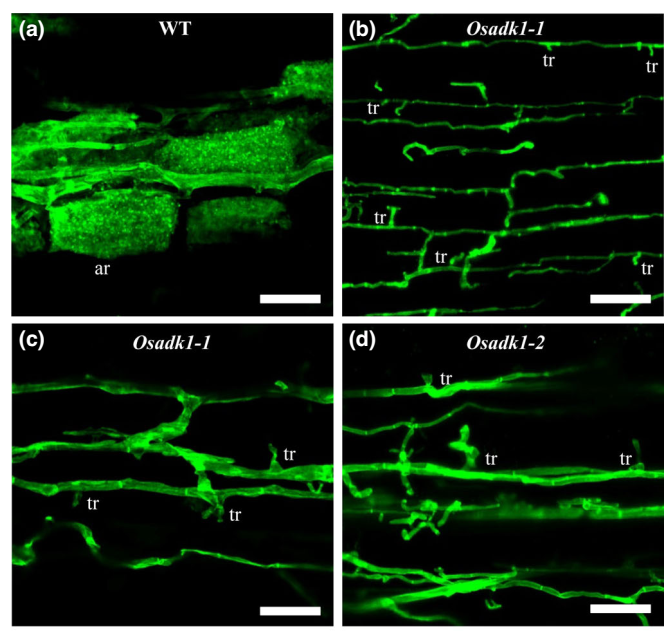 我校生命科学学院王斌教授课题组发现:在水稻建立AM共生过程中,编码一个胞内激酶的基因OsADK1在形成丛枝的细胞中特异诱导表达。通过CRISPR/Cas9技术得到敲除该基因的突变体。与野生型相比,Osadk1突变体的定植率显著降低。更为重要的是,在突变体根中观察不到充满整个细胞的正常丛枝,真菌菌丝进入皮层细胞后丛枝发育停留在trunk阶段,没有继续分化,暗示植物调控真菌丛枝的发育过程在早期阶段就被终止。