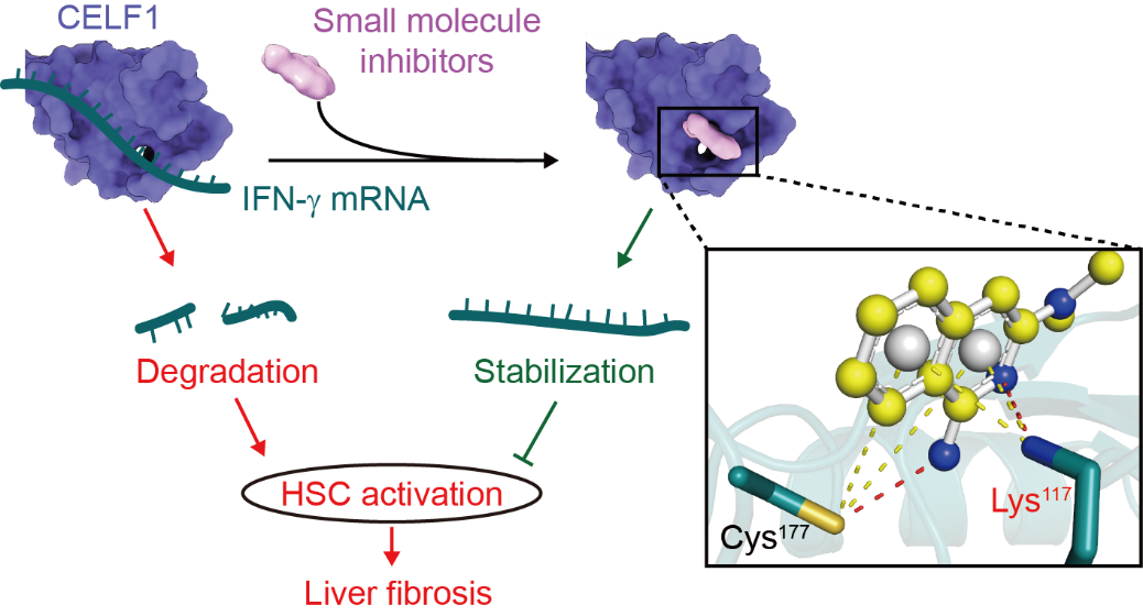 RNA结合蛋白是多种致死疾病的关键致病因素,但目前仍被认为是"不可成药"的靶点。RNA结合蛋白结合靶基因的凹槽比较平滑,一般不具有现有经典激酶等靶点存在的明显药物结合口袋,该结构特点使得针对RNA结合蛋白的药物发现面临巨大挑战。近年来,凯发k8官网徐强/吴兴新团队研究发现RNA结合蛋白CELF1是多种器官纤维化的共性节点分子,可链接促纤维化信号和抗纤维化信号,而敲低CELF1可促进抗纤维化信号,恢复肝星状细胞稳态,为抗纤维化提供新的治疗策略(Nat Commun 2016; Toxicol Appl Pharmacol 2021)。
