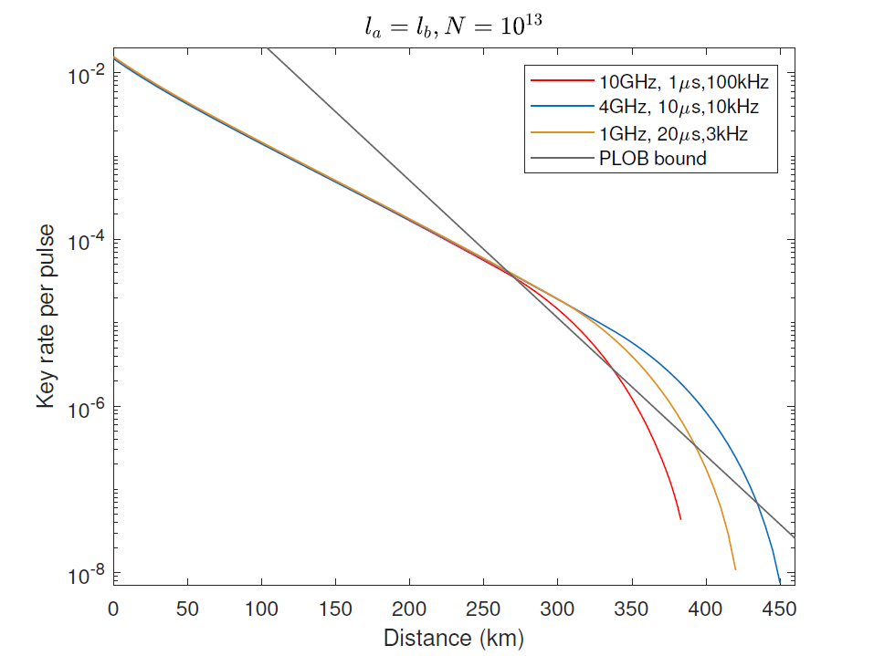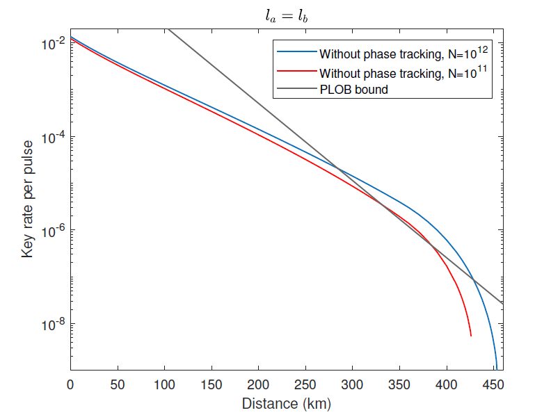 仿真结果表明,对于1 GHz系统,该协议在无相位跟踪的情况下传输距离可达450 km同时去除相位跟踪和相位锁定技术后,协议在有限密钥效应下可以在270公里的距离上打无中继量子信道码率-距离限制。在城际距离协议的密钥率与原始MDIQKD协议相比提高了数万倍。例如,传输300公里密钥率可达0.15 Mbit/s,足以执行包括音频和视频一次一密等各种任务。与此同时,由于该协议无需相位跟踪,其单光子探测器的所有探测计数容量都可以用于量子信号测量,使其在城际距离上实现比使用同频强参考光相位跟踪技术的TFQKD协议高一个数量级的密钥率。