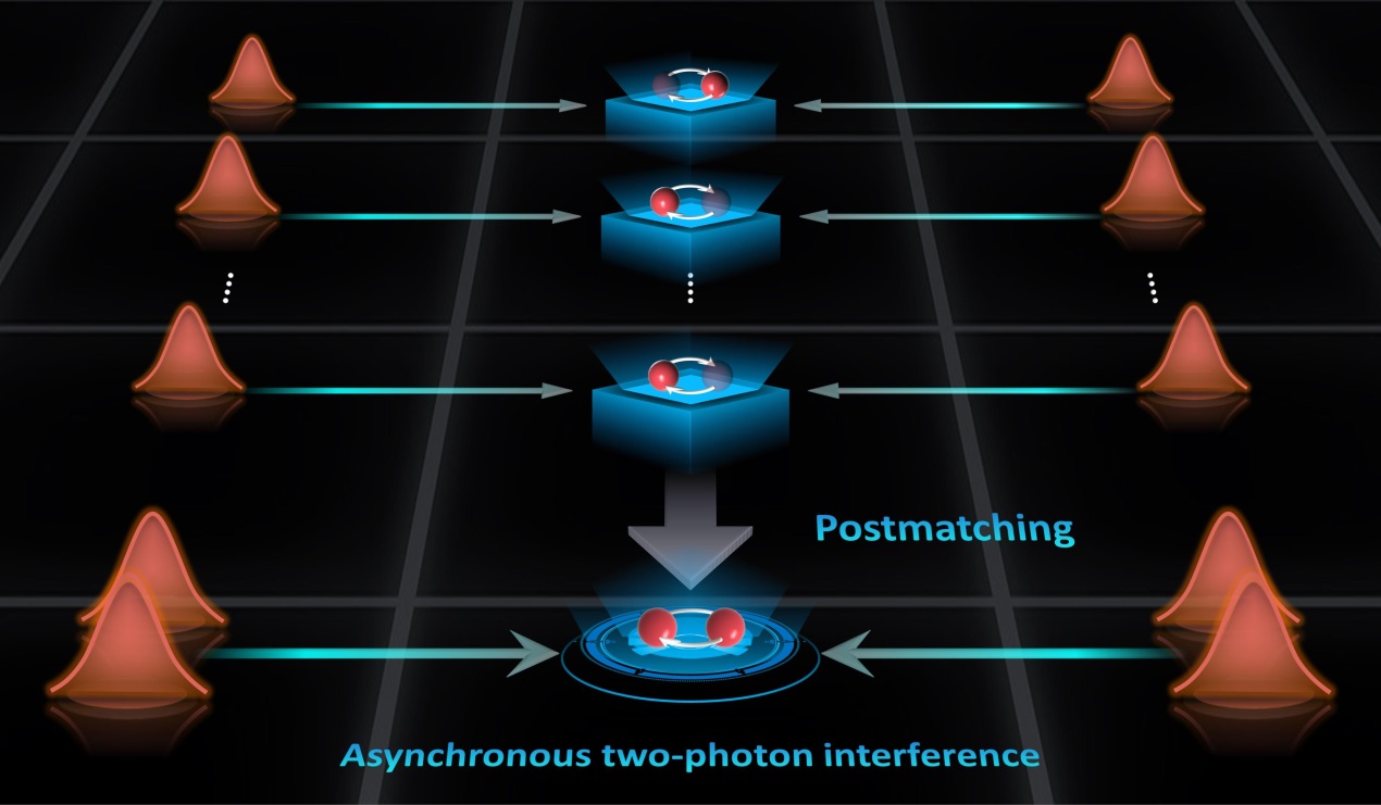 受到对偶纠缠的启发,利用后匹配方法巧妙将同步时间编码转化为异步时间编码,设计出了一种异步MDIQKD协议 通过随机匹配两个探测到的相位相关联的时间箱,以建立异步双光子贝尔态,从而双光子干涉的双轨MDIQKD协议打破无中继量子信道码率-距离限制,将理论上的不可能变为了可能 外,由于每个时刻之间的相位噪声差在较短的时间间隔内近似相等,可以在不使用相位跟踪和相位锁定技术的情况下对两个与相位相关的时间箱进行后匹配,这大幅降低了实验难度。由于无论选择何种非对称源参数,每个用户的单光子对成分密度矩阵在时间和相位基矢下总是相同的,因此该协议适用于用户可以动态访问而不考虑已有用户源参数的量子网络。