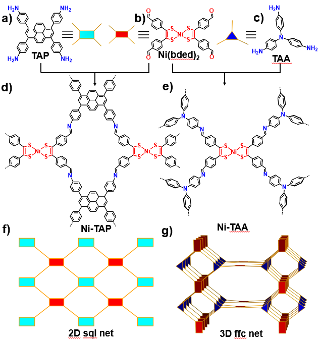 在此基础上,该研究团队新合成了一例基于镍二硫烯配合物的单体,双[1,2-二(4-甲酰基苯)乙烯基-1,2-二硫烯]镍配合物,简称 Ni(bded)2 (图1),与3-连接的三-(4-氨基苯基)胺(TAA)以及4-连接1,3,6,8-四((4-氨基苯基)乙炔基)芘(TAP)通过亚胺键连接合成了两例含有金属单元的共价有机框架(COFs),分别为Ni-TAA和Ni-TAP。其中,Ni-TAP是一种具有sql拓扑的二维网络,而Ni-TAA是具有ffc拓扑的三维网络(图2)。