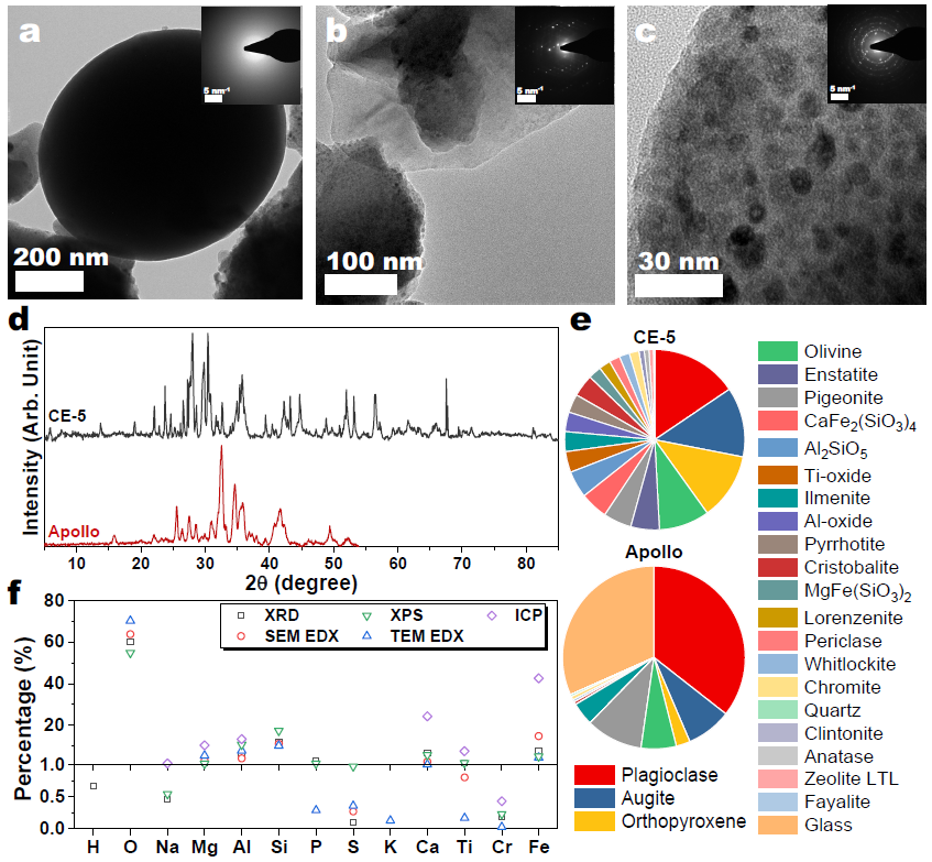 作为月球上最丰富的资源之一,采用月壤作为地外人工光合成催化材料,是月球原位资源利用的重要组成部分。与地球上的催化剂相比,月壤或月壤提取成分作为月球上的人工光合成催化剂,可以大大降低航天器的载荷和成本。嫦娥五号月球样品为实现地外人工光合成提供了一个很好的机会。近日,邹志刚院士、姚颖方教授团队与香港中文大学(深圳)、中国科学技术大学合作,详细分析嫦娥五号月壤的元素组成和矿物结构,从光伏电解、光催化和光热催化三个方面对嫦娥五号月壤的人工光合成性能进行了评估,并基于月壤人工光合成性能提出了可行的月球地外人工光合成策略,为实现“零能耗”的月球生命保障系统奠定了物质基础。