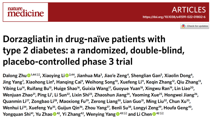 两项III期临床研究的结果分别以“Dorzagliatin in drug-na?ve patients with type 2 diabetes: a randomized, double-blind, placebo-controlled phase 3 trial”和“Dorzagliatin add-on therapy to metformin in patients with type 2 diabetes: a randomized, double-blind, placebo-controlled phase 3 trial”为题同时在线发表于2022年5月12日的Nature Medicine杂志。凯发k8官网医学院附属鼓楼医院朱大龙教授,北京中日友好医院杨文英教授,华领医药陈力博士为第一篇文章的通讯作者;复旦大学李小英教授、凯发k8官网医学院附属鼓楼医院朱大龙教授,华领医药陈力博士为第二篇文章的通讯作者。两篇论文也是Nature Medicine杂志首次发表由中国研究者作为第一作者和通讯作者撰写的新机制糖尿病首创新药。