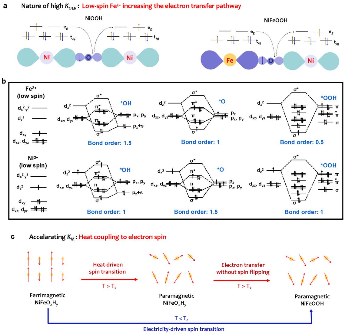 图4. 热-电耦合的物理基础 (a) 低自旋Fe3+通过增加电子转移途径显著提升了OER的质子耦合的电子传输过程。(b) 顺磁态Fe3+符合高效OER的Sabatier催化原理。(c)热致磁相变使得热作为控制材料电子态的重要参量,有效参与电子化学势改变和降低电子转移势垒。
