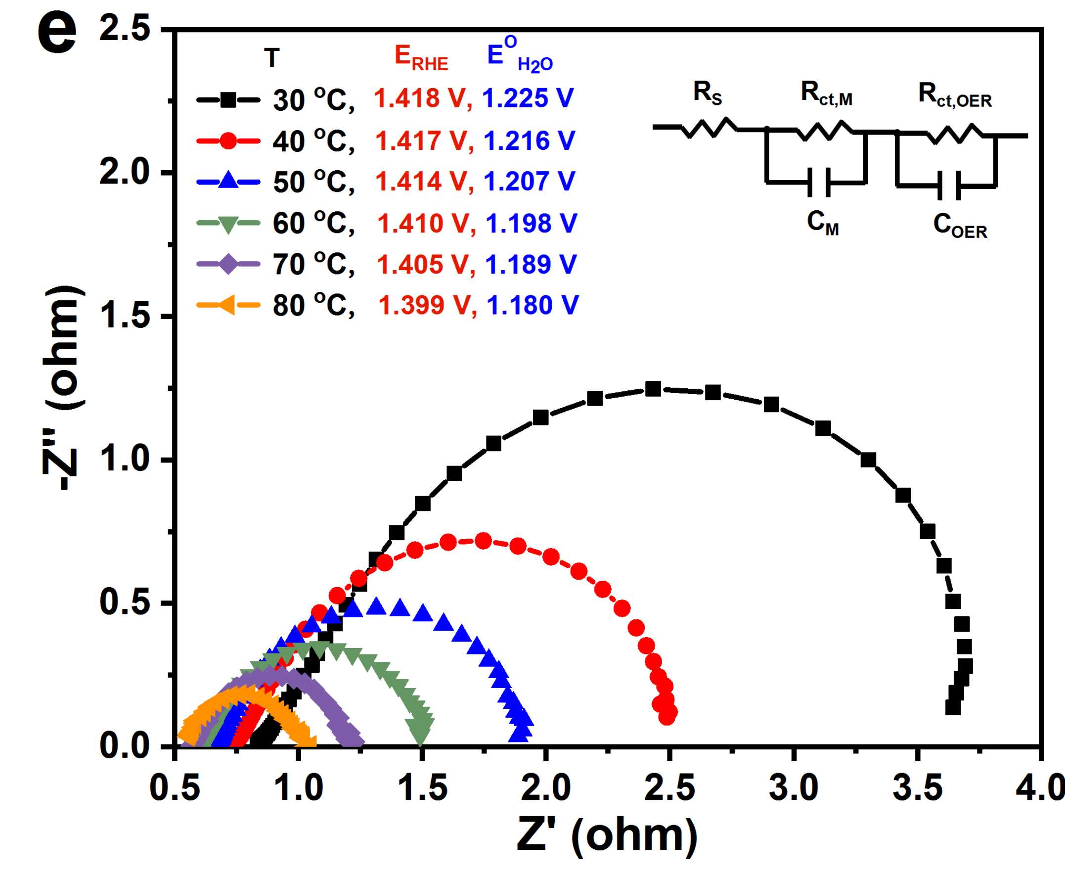 针对以上问题,课题组在对多能耦合制氢研究积累的基础上 (J. Am. Chem. Soc. 2021, 143, 9236; Frontiers in Chemistry, 2022, 10, 902814; J. Phys. Chem. Lett. 2022, 13, 49),提出基于热致物理效应实现高效热-电耦合的可再生能源制氢材料设计理念。以NiFeOxHy (NiFe(OH)2和NiFeOOH的混合物相)电催化剂作为模型催化剂,基于其较低居里温度Tc(70 ?C)设计出一种高效的热-电耦合水分解体系。磁学特性测试研究表明,NiFeOxHy电催化材料在70 ?C发生亚铁磁→顺磁相变(图2a-b),实现了顺磁态的Ni2+/Ni3+氧化和Ni3+氧化水反应,因此有效降低了电子转移势垒,在90 oC下NiFeOxHy的水氧化电流密度达到100 mA cm-2时的电极电位仅为1.392 V。基于热致磁相变的热-电耦合反应中,热不仅仅促进传质过程(Arrhenius方程描述的线性热-电耦合关系),同时也是维持材料电子态的重要参量,因此改变了电子转移势垒并诱发活化能突变(图3a-c)。如图4a所示,NiFeOxHy的亚铁磁-顺磁转变对低品位热较为敏感,从而使Ni2+到Ni3+的氧化具有较低的电子转移势垒。在此过程中,热贡献于电子自旋翻转,有效代替了电力消耗。此外,在顺磁态,低自旋Fe3+具有更多的电子转移通道,更加有利于Fe-O-Ni构型的电子交换相互作用,从而在Ni2+/Ni3+氧化和OER过程中实现高效的电子转移,并以几乎相同的KM和KOER显著加速氧化还原电对媒介的水氧化反应(图4b)。