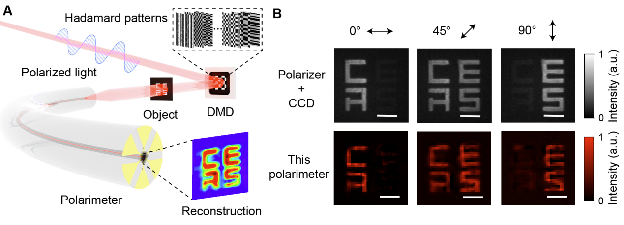 图4 单像素偏振成像的演示。 (A)实验装置的示意图。 (B) 在不同的入射光偏振下,通过偏振片、CCD相机记录的图像与器件重构的图像的比较。
