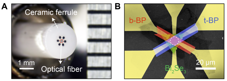 图1 (A) 光纤集成偏振计的实物照片。光纤固定在外径为2.5 mm,内径为125 μm的光纤陶瓷插芯中。 (B) 器件结构的伪彩色SEM图像。白色虚线的圆圈代表光纤的纤芯区域。