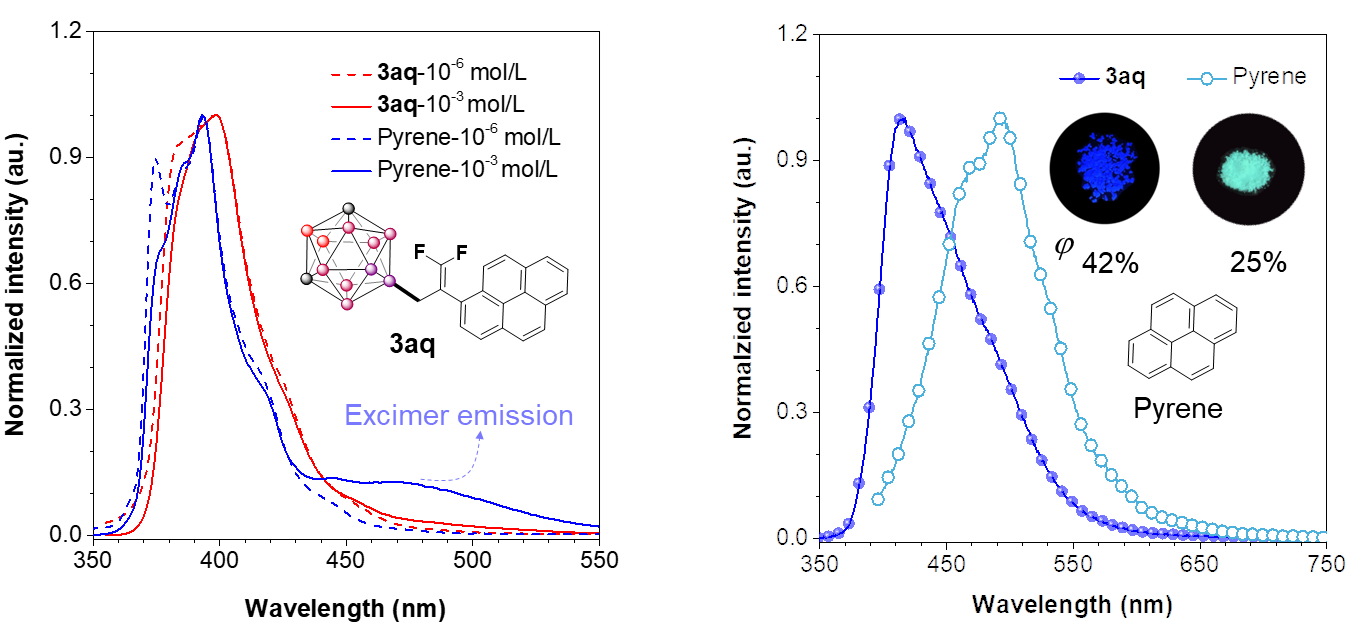 此外,利用该反应可一步获得碳硼烷功能化的稠环化合物,进而可调控一系列稠环芳烃的光物理性质。例如,通过光谱测试研究发现碳硼烷可以有效的抑制芘在溶液中的基激缔合物发光,同时碳硼烷的大位阻效应可以极大的减弱分子间的相互作用,从而大幅提升分子的固态发光效率(42% vs 25%)。实验表明碳硼烷对芘发光波长及效率的调控显著(图2)。