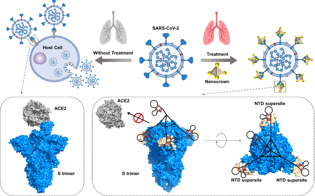 图2. 与S蛋白拓扑结构相匹配的四面体DNA纳米皇冠用于新冠病毒抑制的示意图