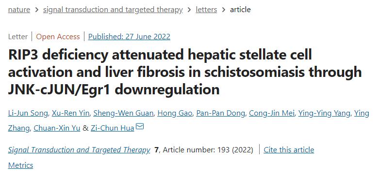 该研究团队前期还细致比较了两种经典的血吸虫感染致肝纤维化模型与四氯化碳致肝纤维化模型的肝脏炎症和免疫反应动态进展的差异,研究工作发表在Frontiers in Immunology, 2020 Oct 7; 11:570524。该研究成果在Signal Transduction and Targeted Therapy(2021年JCR期刊IF排名第67名)发表最新研究成果"RIP3 deficiency attenuated hepatic stellate cell activation and liver fibrosis in schistosomiasis through JNK-cJUN/Egr1 downregulation"。