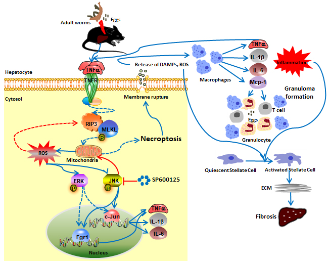 该研究进一步应用JNK抑制剂SP600125治疗后血吸虫感染小鼠。结果表明,血吸虫感染小鼠肝脏中虫卵肉芽肿和纤维化的程度降低,肝脏中炎症因子和ROS的水平下降。该研究揭示了RIP3在血吸虫病肝脏纤维化中的重要作用,RIP3缺乏可降低血吸虫病肝脏纤维化的程度。体内、外实验证实RIP3-JNK-cJUN、Egr-1轴正反馈调控炎症因和ROS的产生,激活肝星状细胞,释放细胞外基质,促进血吸虫病肝纤维化。RIP3及其下游的信号通路可作为血吸虫病肝纤维化的新药物靶点。