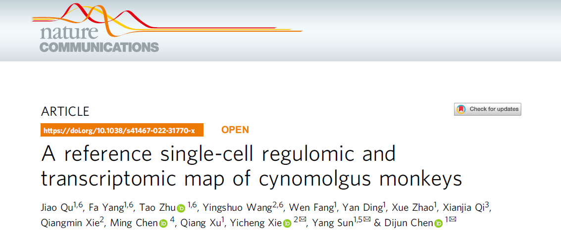 2022年7月13日,凯发k8官网生命科学学院、医药生物技术国家重点实验室陈迪俊/孙洋团队联合浙江大学医学院附属儿童医院谢诒诚团队在Nature Communications在线发表题为A reference single-cell regulomic and transcriptomic map of cynomolgus monkeys的研究论文,该研究利用单细胞测序技术绘制了非人灵长类动物食蟹猴(Macaca fascicularis)主要器官的单细胞转录组和调控组参考图谱。基于该图谱,研究者系统比较了不同器官的细胞分化轨迹和细胞互作模式,描绘其相关分子特征;鉴定了大量的器官和细胞特异性顺式调控元件,构建了器官特异性基因调控网络;此外,通过跨物种比较分析,研究者发现食蟹猴与人类在免疫相关的基因表达模式和细胞通讯方面具有极高的相似性,为食蟹猴用于免疫相关疾病模型的研究提供了理论依据。
