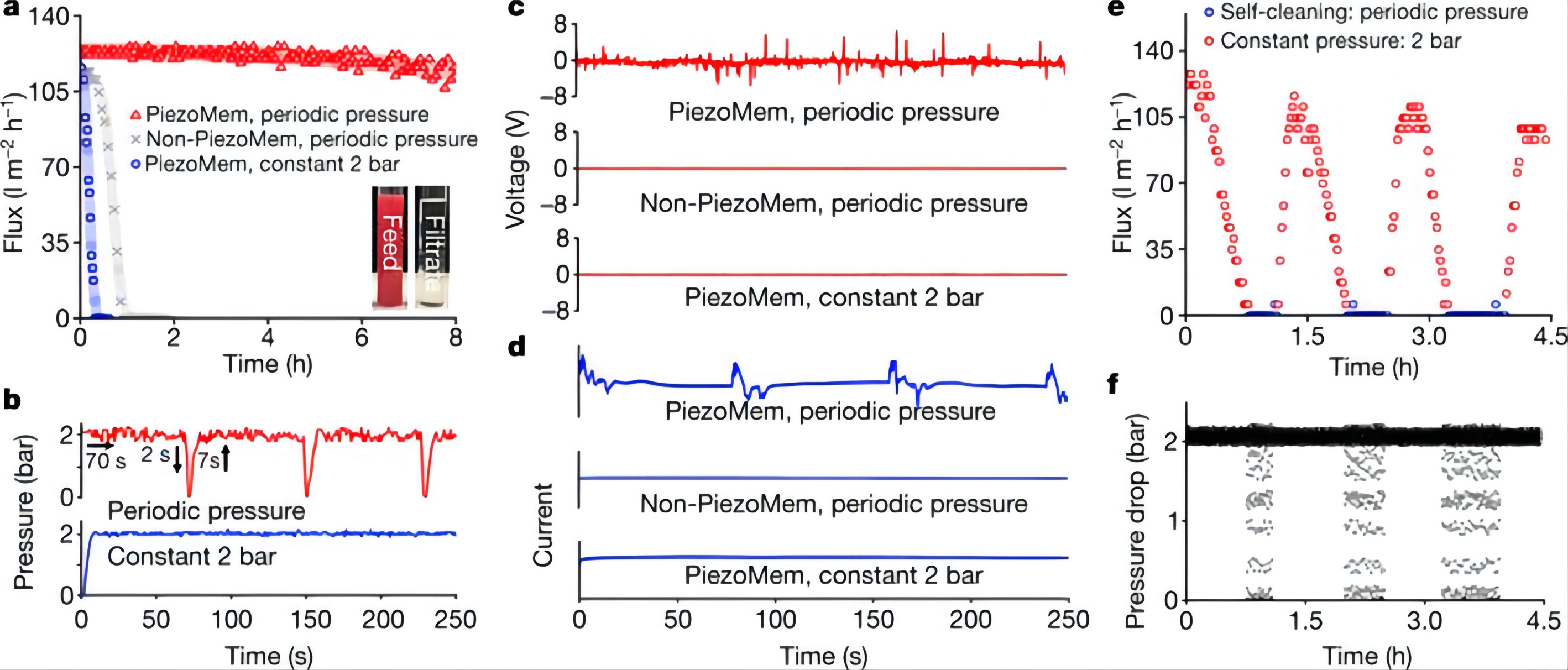 图2 PiezoMem抗膜污染效能(a-b, e-f)和膜分离过程中的压电响应(c-d)