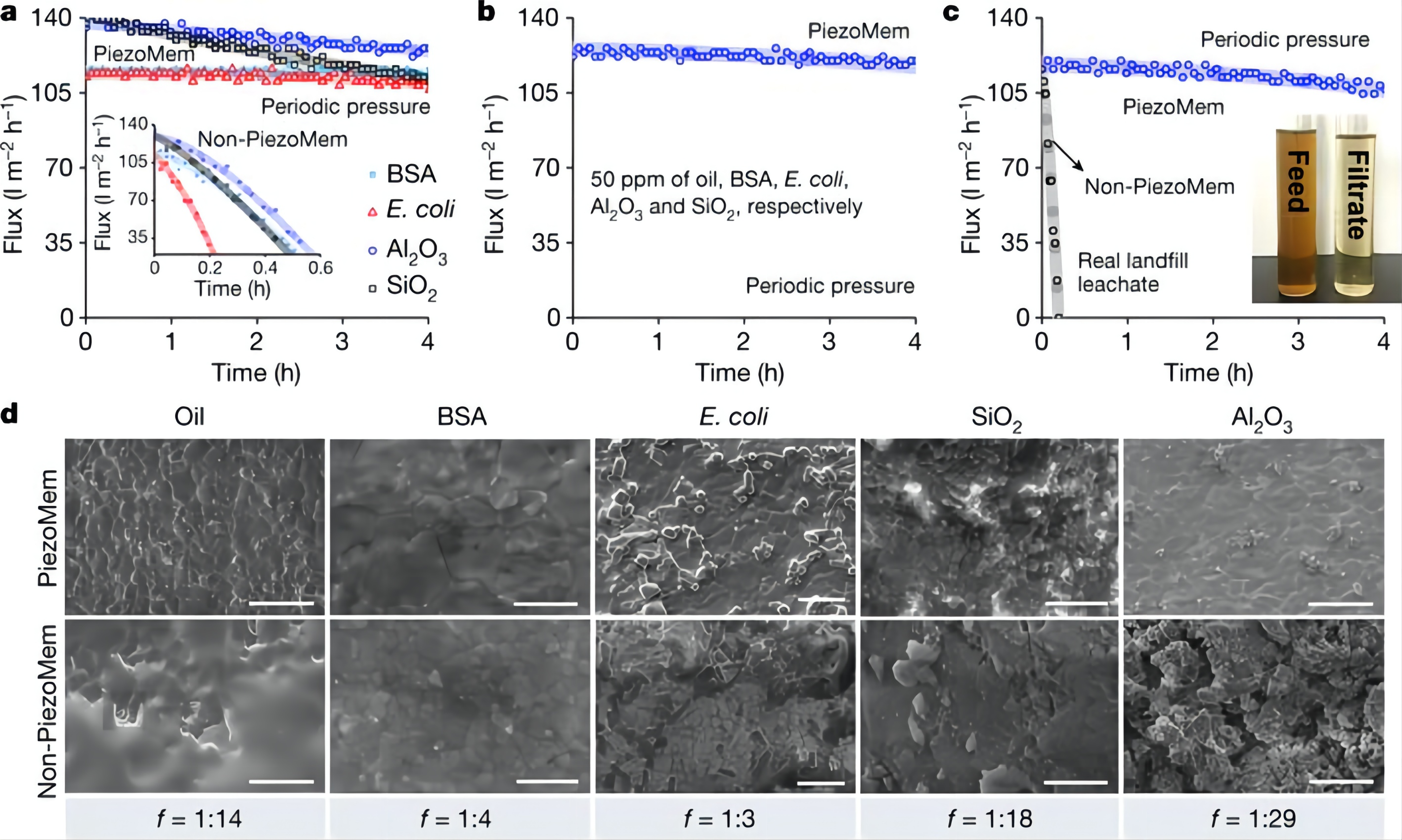 图3 PiezoMem普适性抗膜污染特性(a-c)和膜污染后的膜表面电镜图(d)