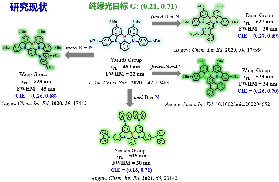 B/N型的MR-TADF材料是目前研究最为广泛的窄谱带发射材料,近年来该类材料在窄谱带蓝光区域的性能已经取得了重大进展。然而,基于B/N骨架构建最大发射波长超过510 nmMR-TADF材料报道仍然较少。延伸最早报道的MR-TADF材料DABNA-1(Adv. Mater. 2016, 28, 2777)母核的共轭长度能实现其发射波长的红移,但盲目地增加分子的共轭程度会扰乱分子内的HOMOLUMO之间分布,并表现出宽的荧光发射和较差的色纯度。根据美国国家电视系统委员会(NTSC)的标准,全彩显示器的制造不仅需要窄谱带深蓝光材料,还需要超纯绿光的显示,相应的CIE坐标为(0.21,0.71)。在已经报道的MR-TADF材料中,DABNA-1υ-DABNA(Nat. Photonics 2019, 13, 678)材料因可实现超窄的深蓝光发射,已经被三星作为蓝光OLED的商用材料。然而,目前已经报道的绿光和红光的MR-TADF材料由于色纯度未能满足所需的NTSC标准,对其探索仍然是非常有必要的。为了实现MR-TADF材料在宽色域OLED显示器中的应用,迫切需要开发窄谱带红、绿、蓝发射的分子设计策略。