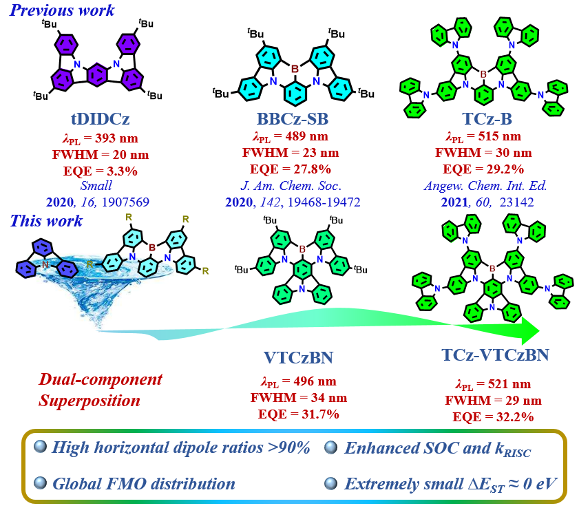 最近,化学化工学院郑佑轩教授课题组在纯绿光多重共振型热活化延迟荧光材料和器件研究中取得新进展。吲哚并[3,2,1-jk]咔唑上引入基于叔丁基咔唑和9'H-9,3':6',9"-三联咔唑的硼/氮结构,获得了两个基于双多重共振效应的发光材料VTCz-BNTCz-VTCzBN,其中基于9'H-9,3':6',9"-三联咔唑的TCz-VTCzBN甲苯溶液中的发射峰值为521 nmFWHM29 nmCIE坐标为(0.21,0.71)表现为目前为止最接近NTSC纯绿光色系的材料。且由于双共振单元结构近乎全域的前线分子轨道分布使得其?EST接近于0 eV和相当大的反系间窜越系数,使得其光致发光效率达到98%且规则的盘状分子结构赋予其极高的水平发射偶极矩(94%)
