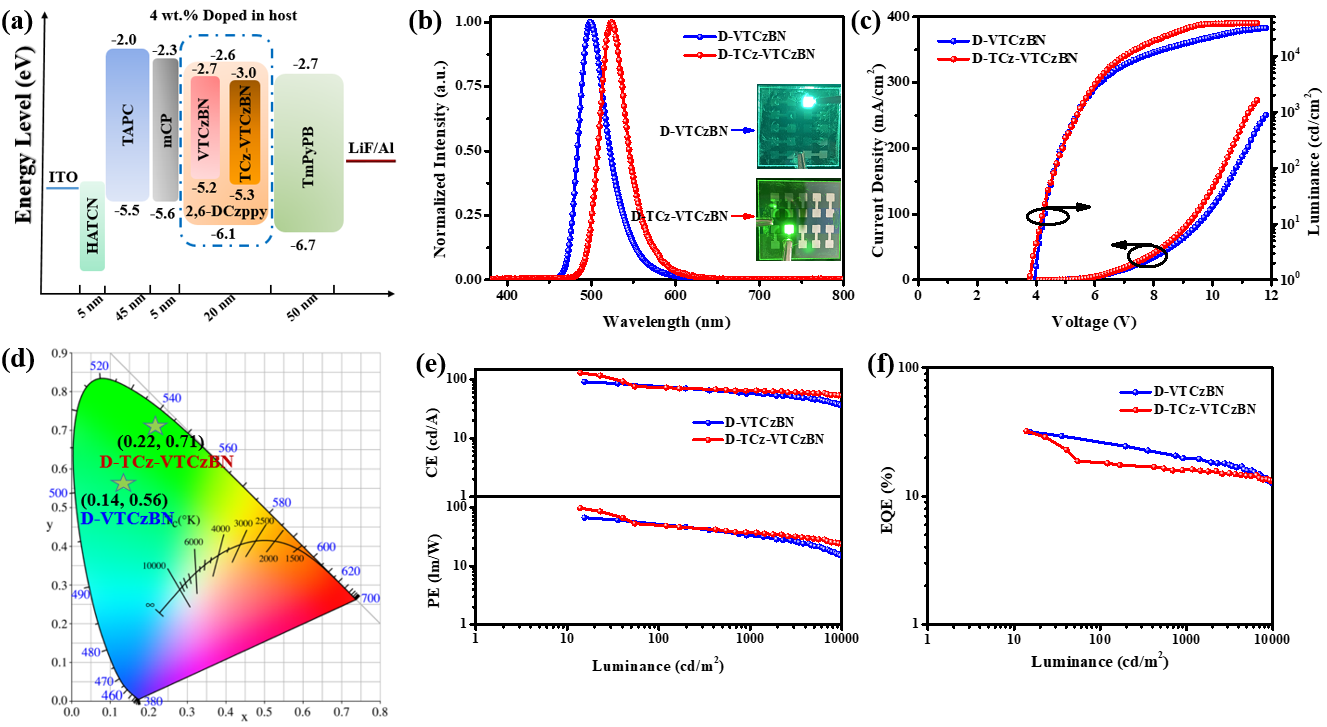 基于TCz-VTCzBN制备的纯绿光OLED器件最大外量子效率高达32.2%,同时表现出超纯绿光CIE(0.22,0.71),与NTSC的纯绿光显示色坐标基本一致。研究结果为兼具高效和高色纯度的MR-TADF材料的设计提供了一定的参考和借鉴。