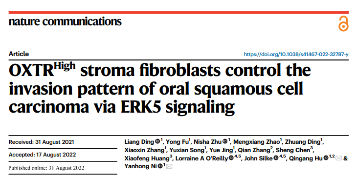 2022年8月31日,凯发k8官网医学院附属口腔医院泥艳红、胡勤刚团队在口腔鳞癌(OSCC)复发的机制方面取得重要进展,发现了一种新的调控肿瘤浸润方式的成纤维细胞亚群,并提出了通过靶向此亚群来改变肿瘤浸润方式的策略,为减少肿瘤患者转移和复发肿瘤提供了新的治疗思路。该研究成果“OXTRHigh stroma fibroblasts control the Invasion Pattern of Oral Squamous Cell Carcinoma via ERK5 Signaling”以研究长文形式在线发表于《Nature Communications》。凯发k8官网医学院附属口腔医院丁亮副研究员为文章第一作者,凯发k8官网医学院附属口腔医院中心实验室泥艳红主任和胡勤刚教授为文章通讯作者。该项研究工作得到凯发k8官网医学院附属口腔医院口腔颌面外科、病理科、检验科、口腔疾病生物样本库的大力支持,同时得到中国博士后基金、国家自然科学青年基金、江苏省自然科学基金、省部共建临床医学中心等项目的资助。