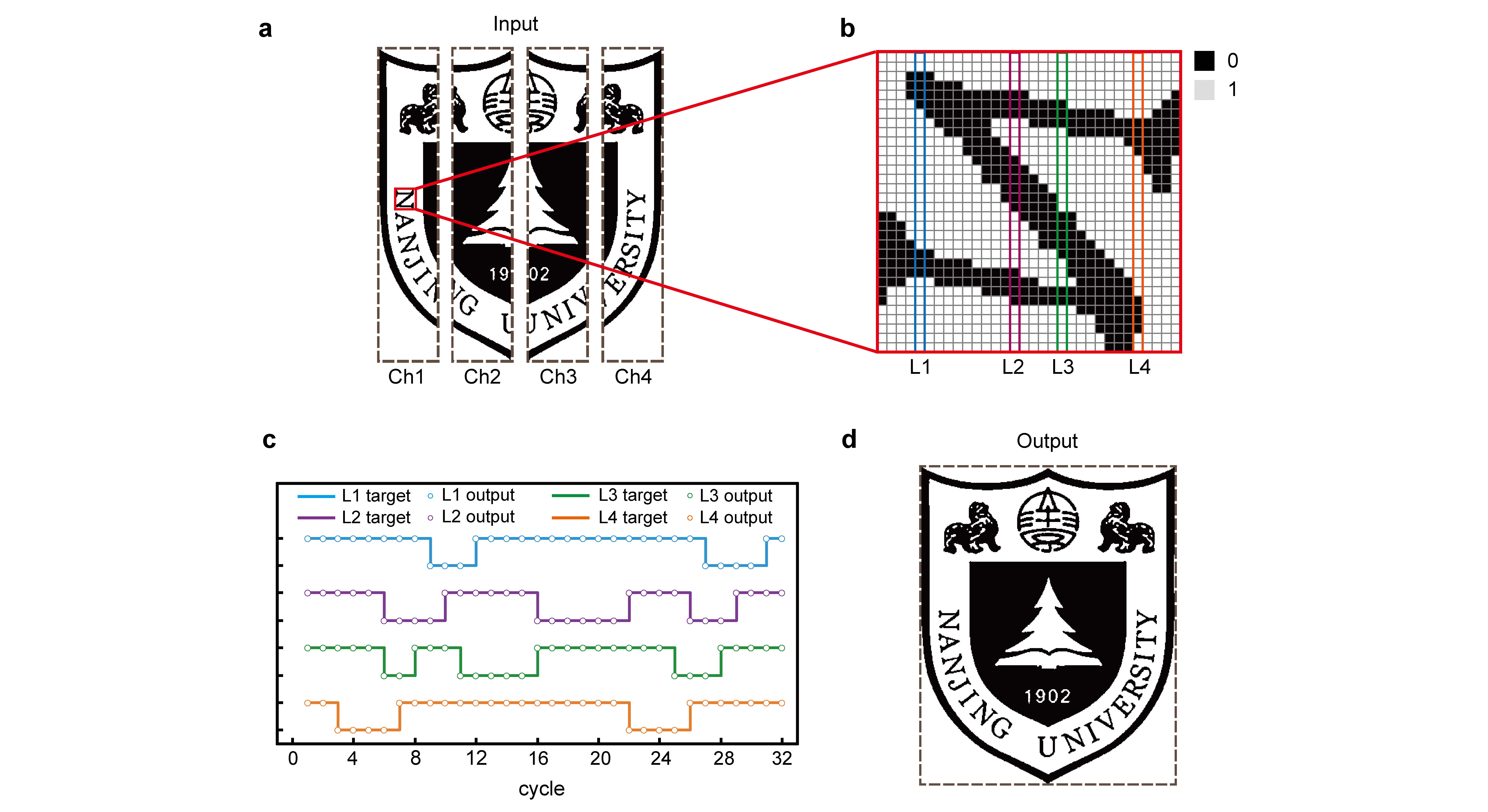2.a凯发k8官网校徽作为目标传输图像被分为四部分,通过四个角动量信道进行同步传输。b像素块,黑白像素点分别代表数据"0""1"c 图(b)所标记的四条数据流的输入与输出对比。d凯发k8官网校徽的图像传输结果。