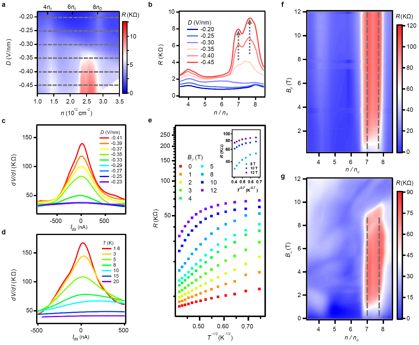 图2:维格纳晶体的实验证据。(a) 电阻随载流子浓度和垂直电场的小范围mapping图。(b)不同电场下的电阻随载流子浓度变化关系图,清晰显示在 和  出现的电阻峰。(c-d)在不同的垂直电场和温度下,微分电阻随电流的变化关系。(e)不同磁场下电阻随温度的变化关系。(f-g)电阻随填充数和水平/垂直磁场的mapping图。