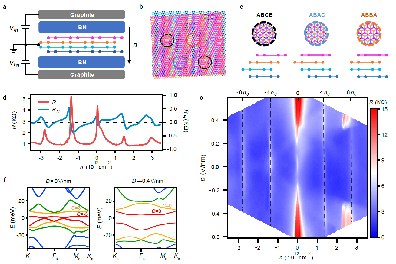 图1:手性堆叠0.75°转角双层-双层石墨烯。(a-c) 莫尔超晶格和电子输运器件示意图。(d) 在1.5K温度、200mT垂直磁场和零垂直电场条件下的纵向电阻和霍尔电阻对载流子浓度的依赖关系。(e)电阻随载流子浓度和垂直电场的mapping图。(f)在不同垂直电场下的电子能带结构和陈数计算结果。