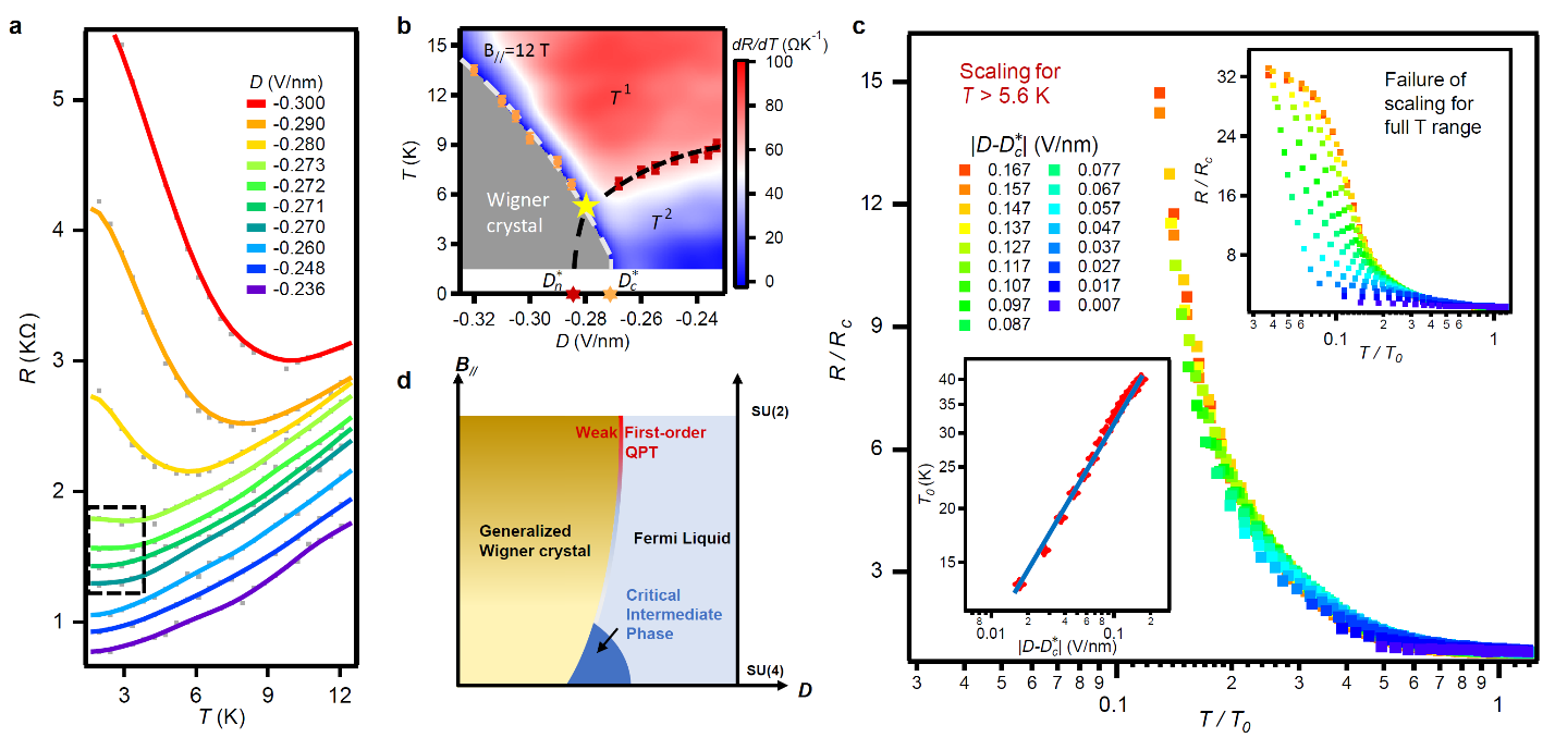 合作团队发现,在该量子模拟器中,通过改变垂直电场可以连续精准地调控体系中的电子关联强度,从而实现了维格纳晶体的量子融化。与常规的量子相变不同,这类量子融化具有两个不同的量子临界点,并且这两个量子临界点所对应的量子标度行为展现出具有不同临界指数(如图3所示)。同时,两个临界点之间的量子临界区域表现为奇异金属行为,且可以持续到最低温,表明临界中间态的存在。随着水平磁场的施加,维格纳晶体区域变大,量子临界区域变小,两个量子临界点逐渐靠近并交换位置,形成了一个费米液体和维格纳晶体的重叠区域。该重叠区域从最低温一直延续到T*≈5.6K,展现出电阻不随温度变化的特性,说明此时关联长度是不随温度变化的常量,这导致量子临界标度行为的失效。当温度升高至5.6K以上时,体系中的奇异金属行为和量子临界标度性恢复,从而展现出一种新型的量子临界行为:量子赝临界性(如图4所示)。