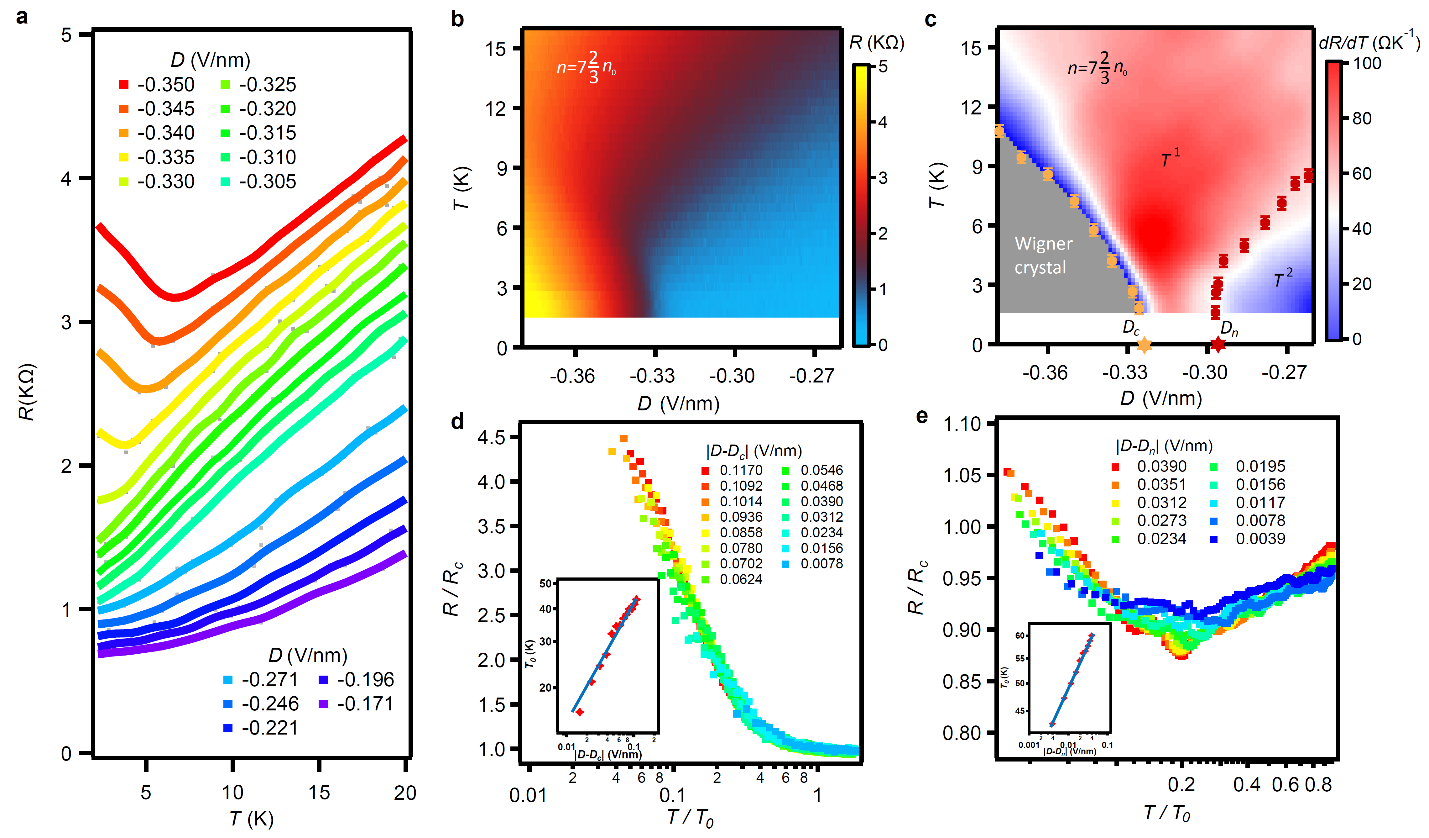 图3:零磁场下的量子两步临界性。(a)不同电场下的电阻随温度变化曲线。(b-c)电阻R以及dR/dT随电场和温度变化的mapping图。(d-e)绝缘区域和金属区域的临界标度分析,展示出不同的量子临界点和临界指数。