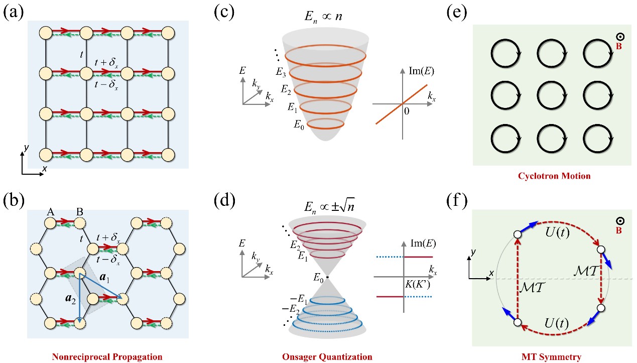 3:(a)非互易Harper-Hofstadter模型和(b)非互易蜂窝格子模型。(c,d)对应(a,b)模型中的复数能谱以及Onsager-Lifshitz量子化轨道示意图。(e)带电粒子在磁场中的准经典轨道。(f)内秉MT对称性的准经典图像理解。
