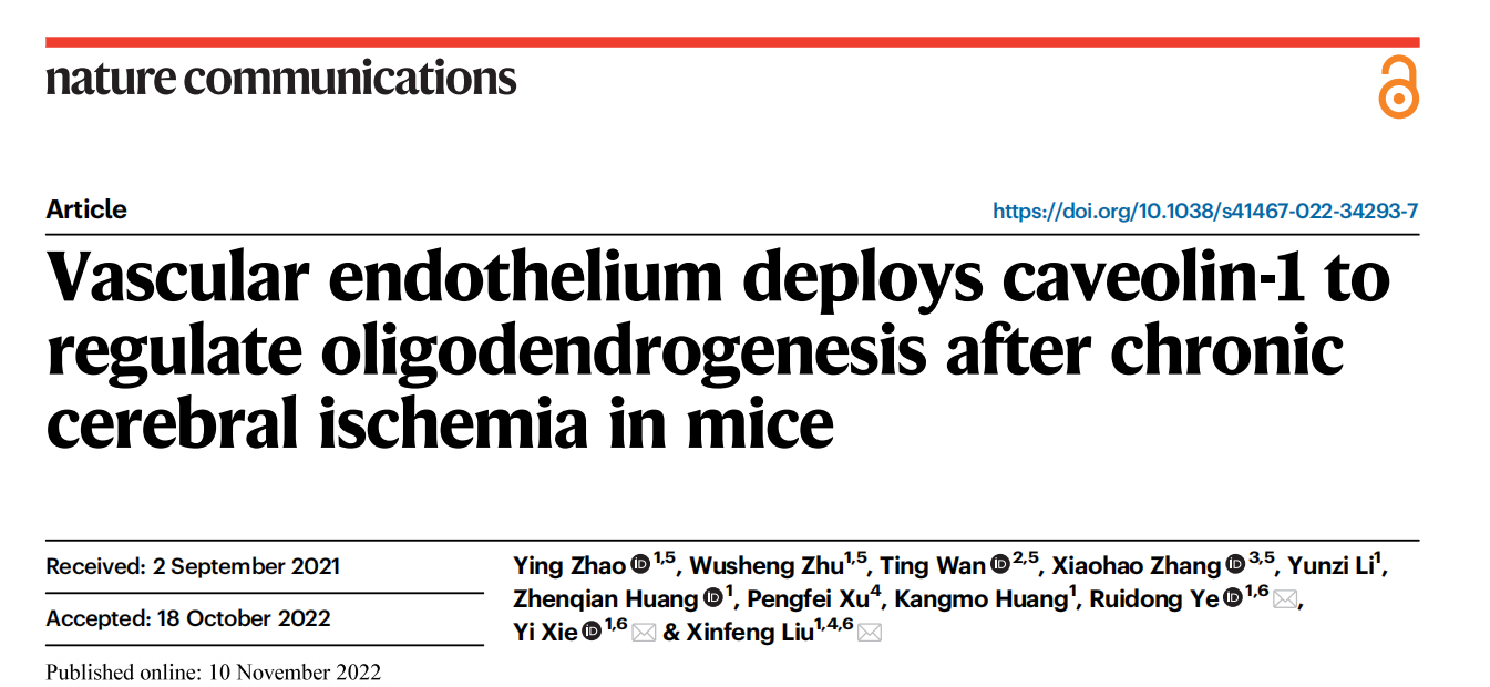 2022年11月10日,凯发k8官网医学院附属金陵医院、凯发k8官网神经病学研究所刘新峰教授、谢怡博士和叶瑞东副教授团队在《自然通讯》(Nature Communications)杂志上在线发表了最新研究成果"内皮Cav-1蛋白在慢性脑缺血中通过内皮-少突偶联调节髓鞘生成(Vascular endothelium deploys caveolin-1 to regulate oligodendrogenesis after chronic cerebral ischemia in mice)"凯发k8官网医学院附属金陵医院刘新峰教授、谢怡博士后和叶瑞东副教授为文章的共同通讯作者。凯发k8官网医学院博士生赵颖、万婷和凯发k8官网医学院附属金陵医院朱武生教授为该研究论文的第一作者。研究工作受到国家自然科学基金项目(批准号81701180,82171331,U20A20357,81870946,81901248, 82101406)、中国博士后科学基金(批准号2019T120968,2019M664011)、江苏省重点研发计划项目(批准号BE2020700)和中央高校基本科研业务费专项资金(批准号WK9110000056)的资助。