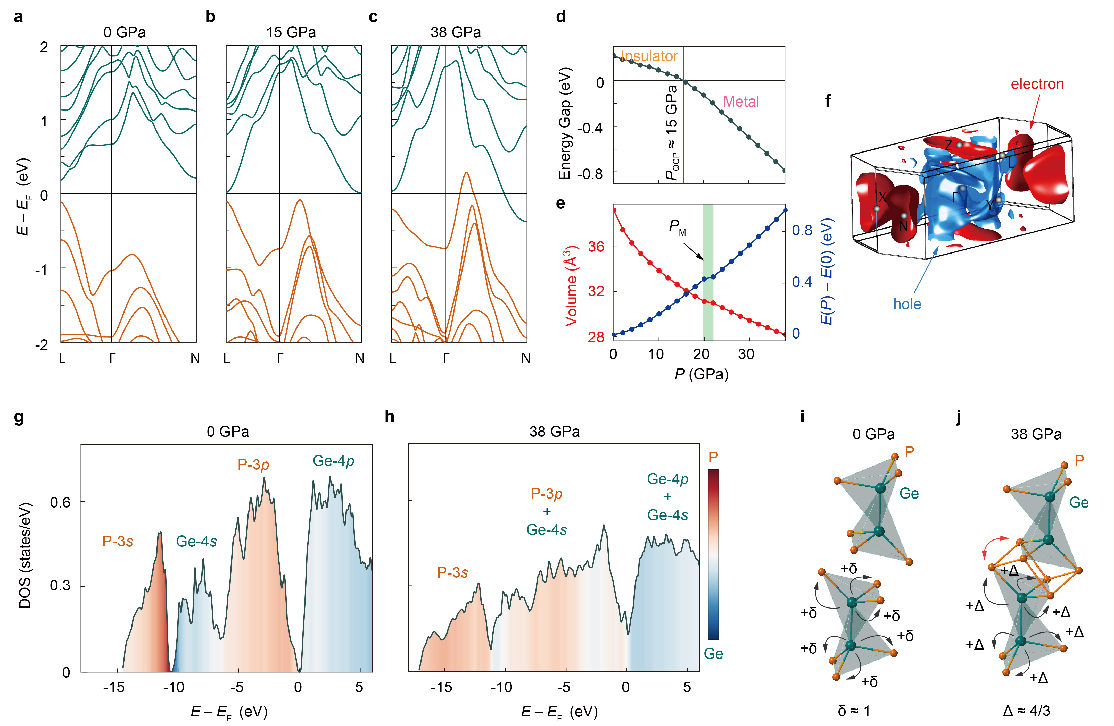 图2. 第一性原理计算得到的GeP电子结构和价态跳变现象随压力的演化行为。(a–c)不同压力下的电子能带结构。(d)带隙的压力依赖性。(e)自由能和晶胞体积的压力依赖性。(f)38.0 GPa下的费米面。(g–h)不同压力下的轨道投影态密度。(i–j)压力诱导的准二维单斜结构到三维单斜结构的相变示意图。