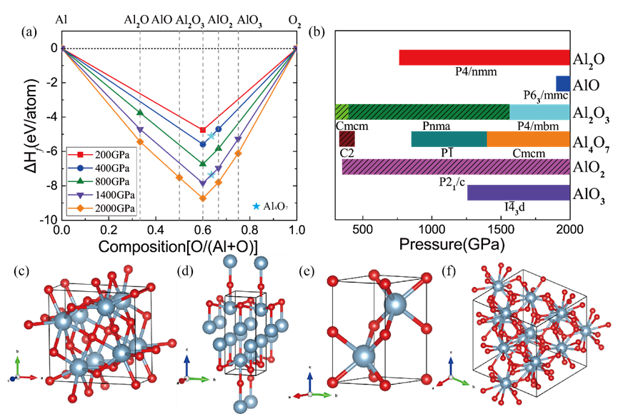 基于这样的背景,孙建教授课题组用自行开发的基于机器学习和图论辅助的晶体结构搜索方法MAGUS和第一性原理计算,对高压下的铝氧化物晶体结构,以及们在高温高压下的物态进行了系统研究,得到了一系列令人惊奇的理论结果。他们预言,在巨行星内部压强环境下(大于750 GPa),种新铝氧化物会成为稳定的结构(图1a),包括对称性为P4/mbm的三氧化二铝(图1c);对称性为P4/nmm的一氧化二铝(图1d);对称性为P63/mmc一氧化一铝(图1e);对称性为I-43d的三氧化铝可见在极端压强下,铝元素可以展现出多种不同的化合价。