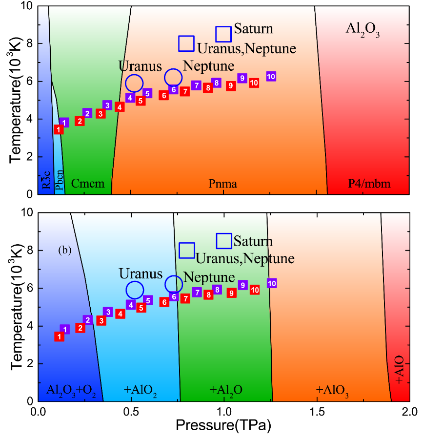 基于准简近似(QHA)计算,他们构建了完整的氧化合物压强-温度相图(如图4)。新型的三氧化二铝P4/mbm相稳定U2S3构型之后(1560GPa除了三氧化二铝随着压强增大二氧化铝,一氧化二铝,三氧化铝和一氧化一铝依次出现根据前人的行星模型,P4/nmm一氧化二铝可能出现在质量高于7倍地球质量的超级地球,或者是质量高于6地球质量的海洋形态行星内部。从不同的文献获得的太阳系行星的核幔边界条件(CMB)略有不同,但两种常用模型(Nettelman模型与Guillot模型)中海王星的核幔边界条件正好位于一氧化二稳定温压区域,这表明本文预言的P4/nmm相一氧化二铝可能在某些行星内部广泛存在。