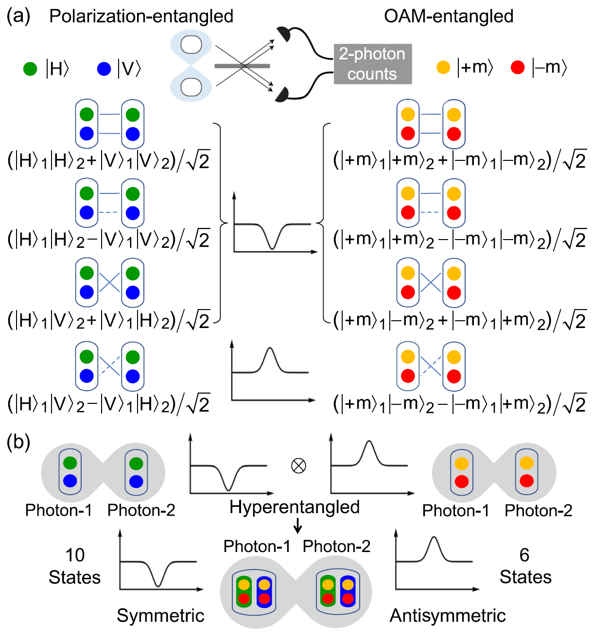 1. 双光子干涉聚束和反聚束现象(a) 4单自由度Bell中有3个对称态和1个反对称态(b) 16个偏振和轨道角动量超纠缠Bell10个对称态和6个反对称态