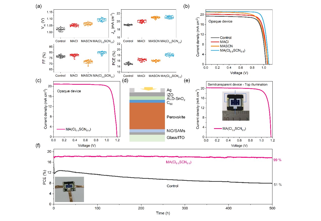 图3 不同添加剂引入的钙钛矿太阳能电池光伏性能。a) 30个不透明器件的光伏参数(Voc,Jsc, FF, PCE)。b) 最佳不透明器件(面积0.049 cm2)的J-V曲线。c) 经MA(Cl0.5SCN0.5)和表面钝化处理的最佳不透明器件的J-V曲线。d) 从IZO侧照射的半透明电池示意图。e)  MA(Cl0.5SCN0.5)冠军半透明电池的J-V曲线(面积为1.05 cm2)。f) 封装的半透明电池在空气(相对湿度20 - 40%)中的最大功率点(MPP)跟踪。
