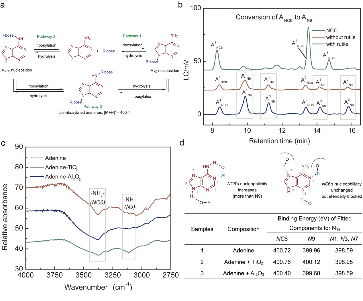 最后,作者研究了该反应可能存在的多种机理(图5a)。在酸和钛矿的作用下,碱基与核糖发生直接糖苷化生成N9核苷(路径1),或NC6产物(路径2),或双核苷化产物(路径3)。经实验证明,早期湿干循环中,N9核苷的产率升高应归因于路径1中酸和钛矿的共同促进作用。但在后期循环中,N9核苷的增长与NC6产物的消耗基本持平,因此作者推断存在路径2,即NC6产物水解后,在钛矿作用下重组生成更稳定的N9核苷。对照实验证明,钛矿对路径2的发生有明显的促进作用(图5b)。而LC-MS和TIC数据证明了双核苷化产物的存在(路径3)。为进一步阐释机理,作者通过红外光谱(图5c)和X射线光电子能谱(图5d),研究了嘌呤、嘌呤二氧化钛混合物、嘌呤氧化铝混合物的光谱特征,分析了钛矿和嘌呤间可能存在的特殊作用,以解释钛矿对N9区域选择性的提升。
