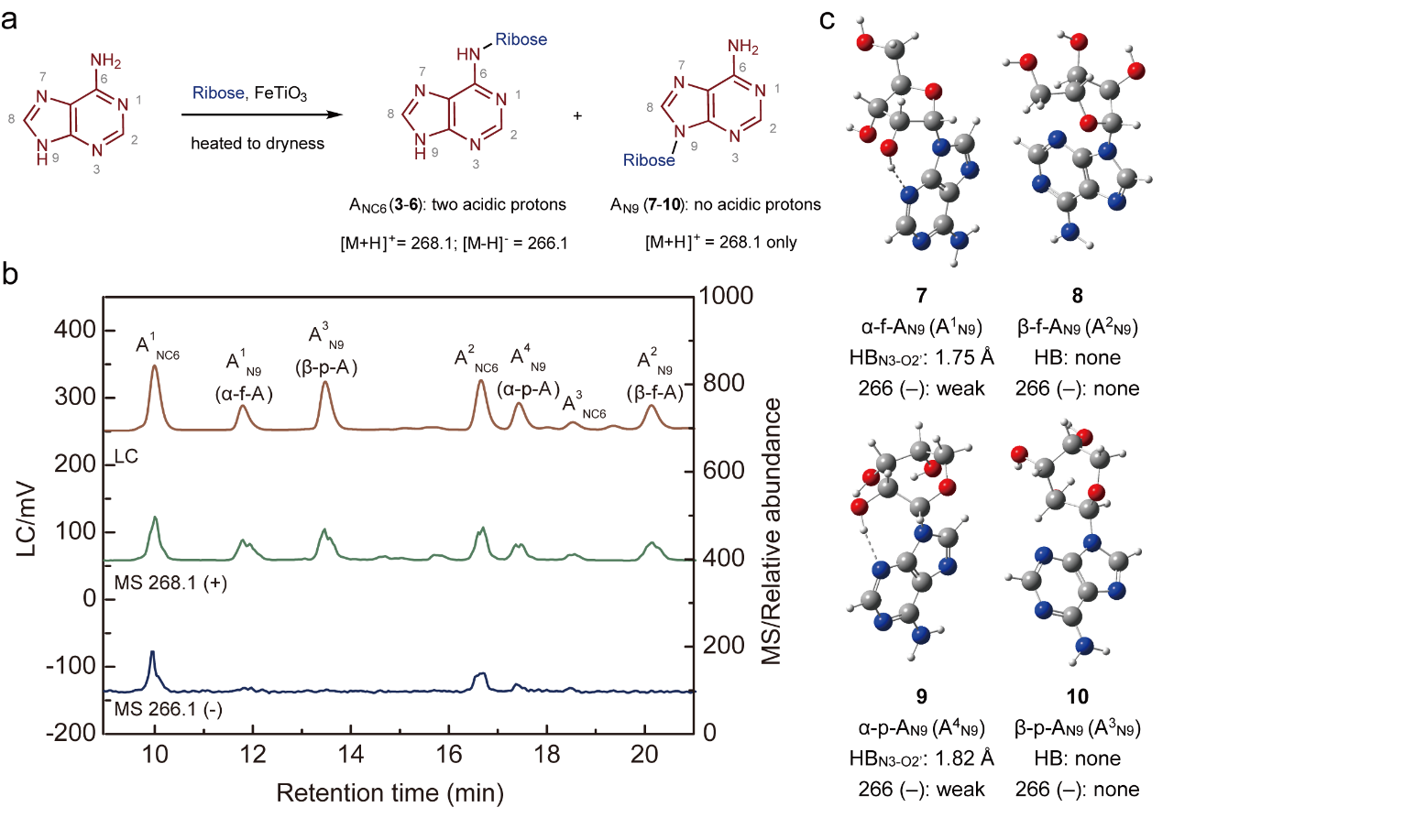 首先,作者初步尝试了钛铁矿(FeTiO3)存在下的腺嘌呤核苷化,在pH = 1,75°C下将反应混合物敞口蒸干。腺嘌呤核苷化理论上可生成8种产物异构体(图1),故完善的产物分析是开展该项工作的先决条件。通过总离子色谱(TIC,图2b)和密度泛函理论计算(DFT,图2c)验证,作者初步确定了AN9和ANC6这两类产物的分组。随后,将反应混合物与Carell课题组提出的间接路线的产物(Science 2016, 352, 833)以及α-腺苷和β-腺苷标样做混合进样,进一步确定了4种AN9异构体。最后,用制备级色谱柱分离出各个产物,通过1H NMR完全确认了3种ANC6异构体和4种AN9异构体。可喜的是,该反应具有极高的N9产率(∑AN9 = 8.9%)和前所未有的∑AN9/∑ANC6比率(1.1/1)。