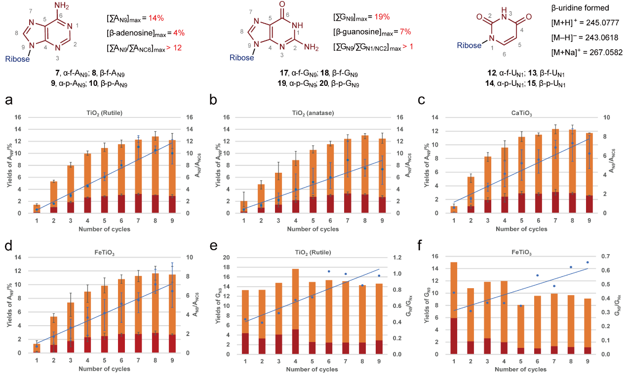 作者继而探索了在原始地球的“湿干循环”条件下,各种钛矿对于核苷化的促进作用。作者尝试采用不同类型的二氧化钛(金红石和锐钛矿)和钛酸盐(CaTiO3和FeTiO3),在更温和的温度下(70°C)将水蒸干,再补充水至原体积,于70°C下再次蒸干。重复循环9轮,每轮循环后测定反应产率和选择性(图3a-d)。结果显示,金红石和锐钛矿对于N9核苷化展现出较高活性(∑AN9分别为13.9%和13.4%),而FeTiO3和CaTiO3则活性略低(∑AN9为12.7%和12.9%)。除了实现比单次蒸干更高的∑AN9/∑ANC6比率(13:1)外,还生成了很多β-腺苷(3.6%)。此外,作者开展了有/无钛矿的对照实验,以及FeTiO3/FeCl2的对照实验,证明了钛矿对于N9选择性有着不可或缺的作用。