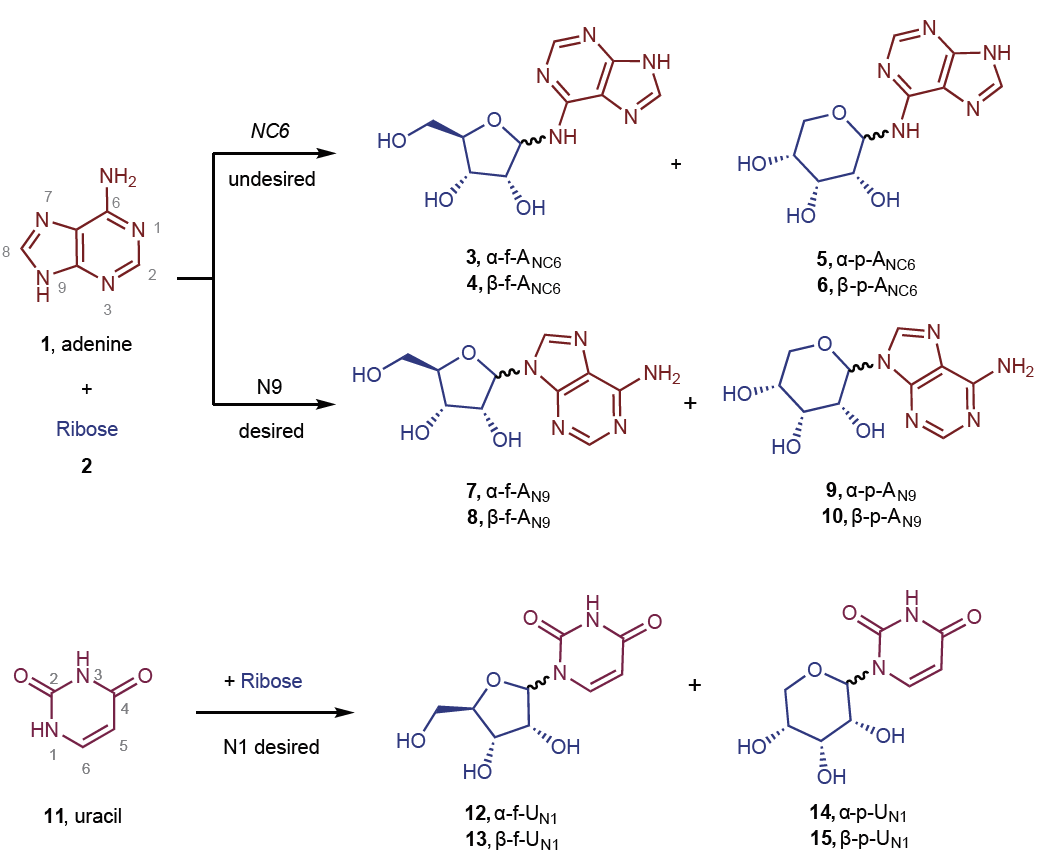 在生命起源研究中,“RNA世界”(The RNA World)是目前影响最大的假说之一,即存在一个早期生命体系,由RNA同时承载遗传编码和实施催化功能。“RNA世界”假说虽然受众较广,但其中多个核心问题尚未解决,如核糖的生成、碱基的形成、核苷化、磷酸化和核苷酸的聚合。在核苷化这一关键步骤中,由于嘌呤N9位和嘧啶N1极弱的亲核性,使得碱基和核糖直接缩合形成糖苷键成为困扰研究者们的难题。自1970年代Leslie Orgel开始探索核苷化以来,该反应一直存在产率低、选择性差、与原始地球环境不符等挑战。对于嘌呤而言,糖苷键优先形成于NC6位而非RNA中的N9位,而嘧啶的直接核苷化几乎没有先例(图1)。