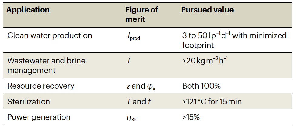 表1. 太阳能蒸发典型应用以及相应的追求指标